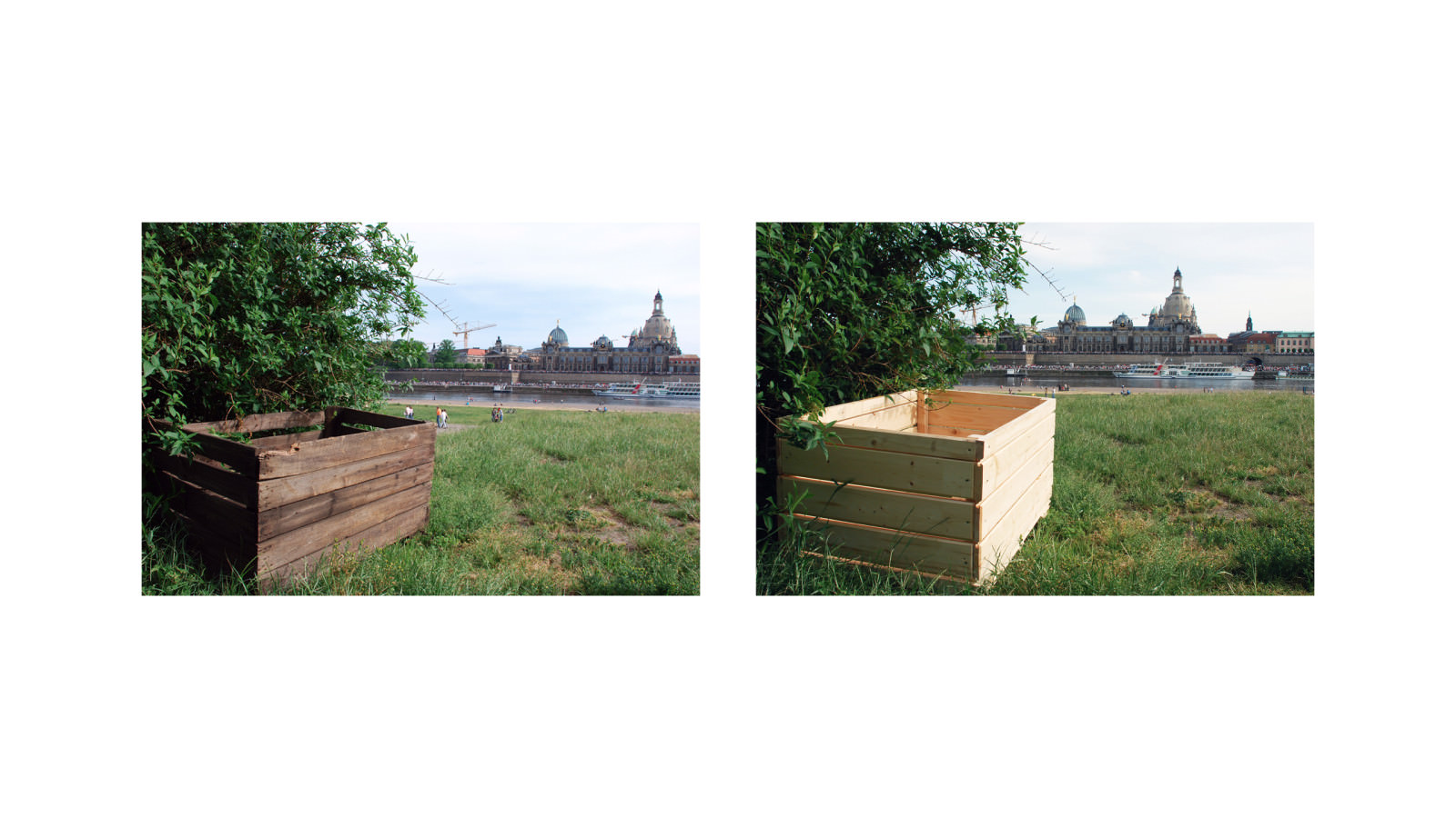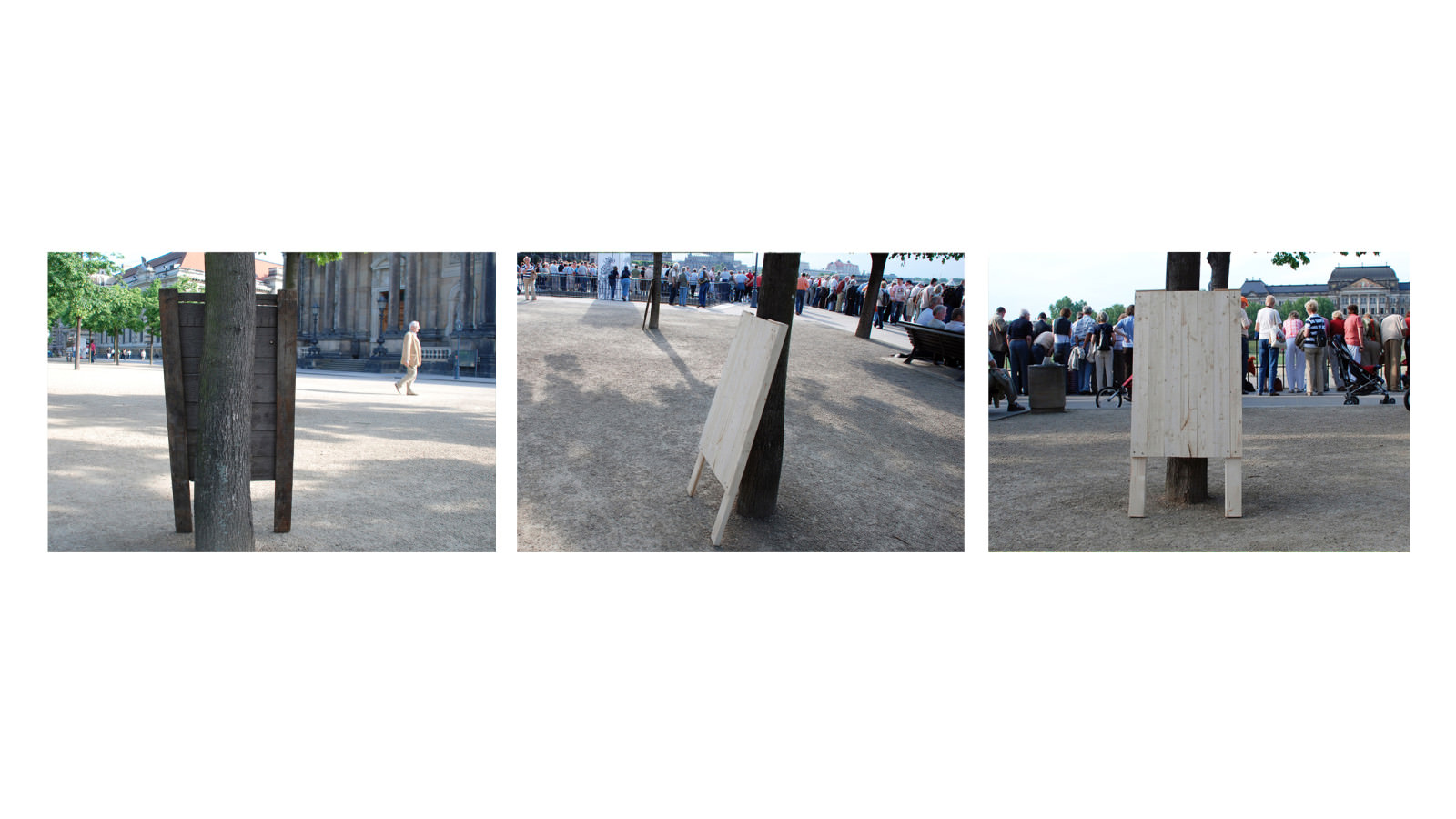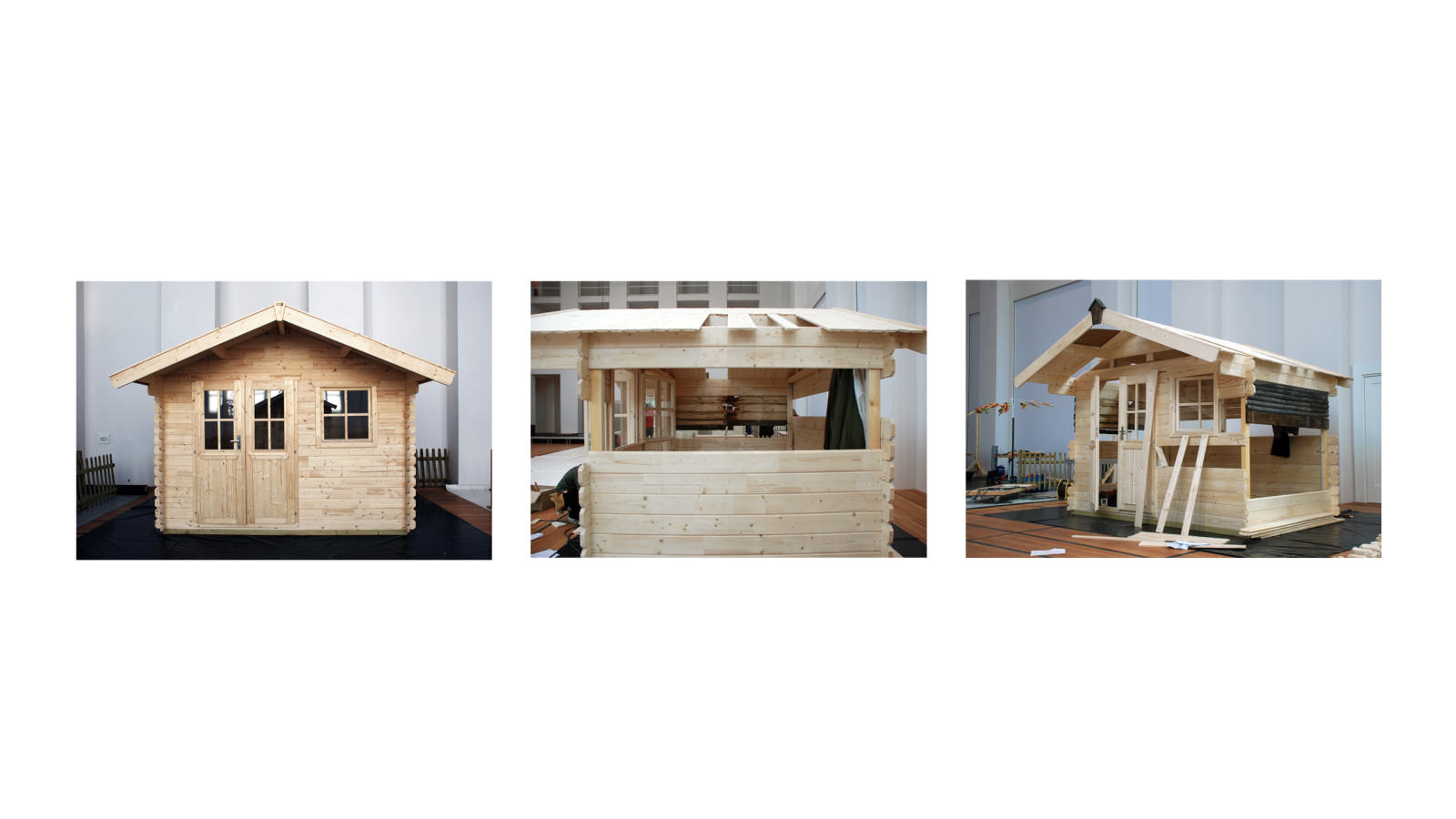 Intervention / RauminstallationVom 7. bis zum 27. Mai 2007 tragen Hofmann&Lindholm Stück für Stück einer Schrebergartenhütte ab, die sie zuvor im Festspielhaus Hellerau aufgebaut hatten. Getauscht werden Bretter, Schrauben oder Beschläge gegen Holz- und Metallelemente, die im öffentlichen Raum der Stadt Dresden zu entdecken sind. Elemente der Hütte nehmen stellvertretend ihren Platz im öffentlichen Raum der Stadt ein, während umgekehrt die Fundstücke aus dem öffentlichen Raum der Stabilität der Hütte im Festspielhaus dienen.