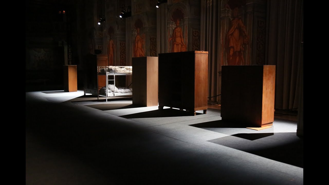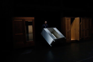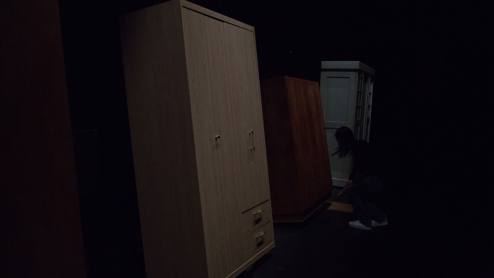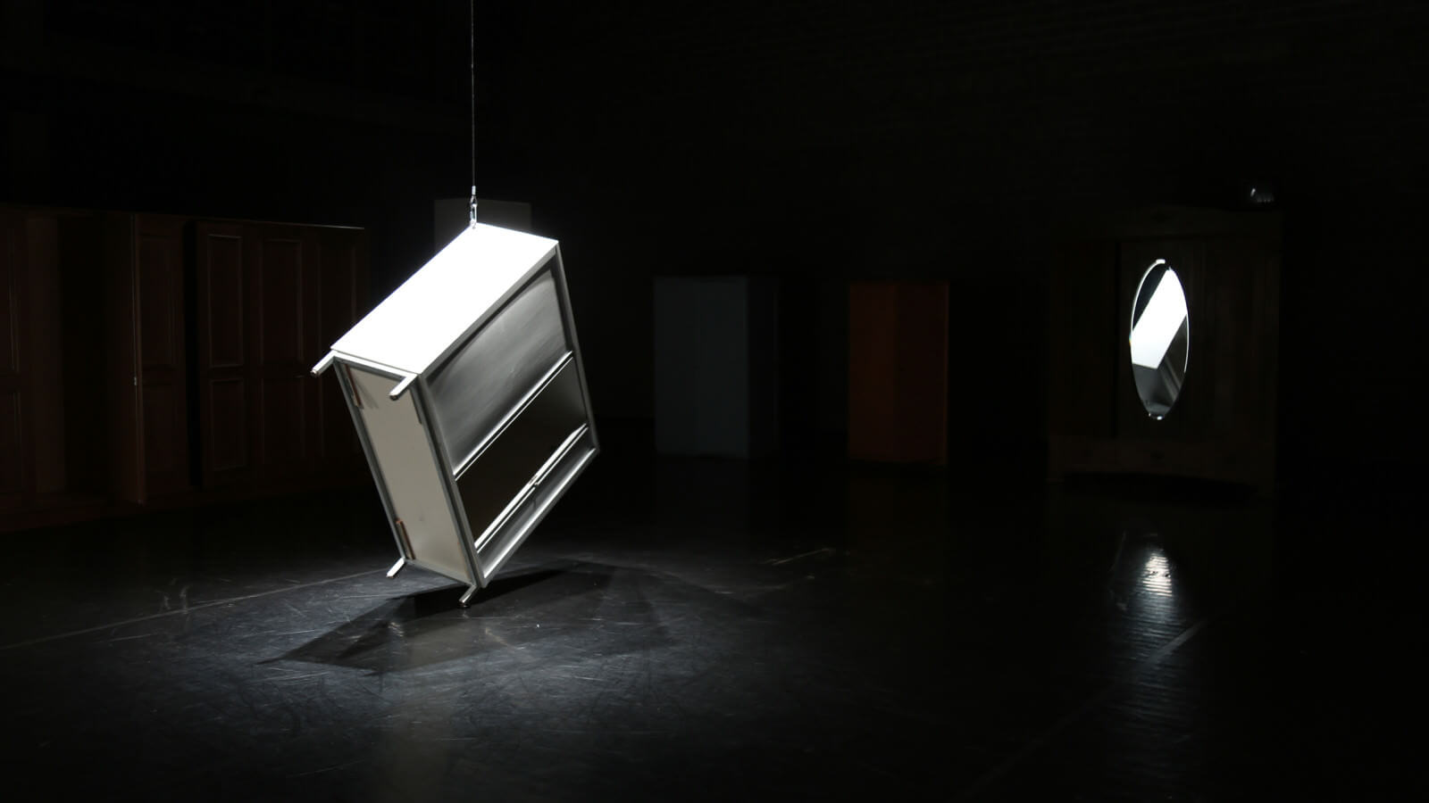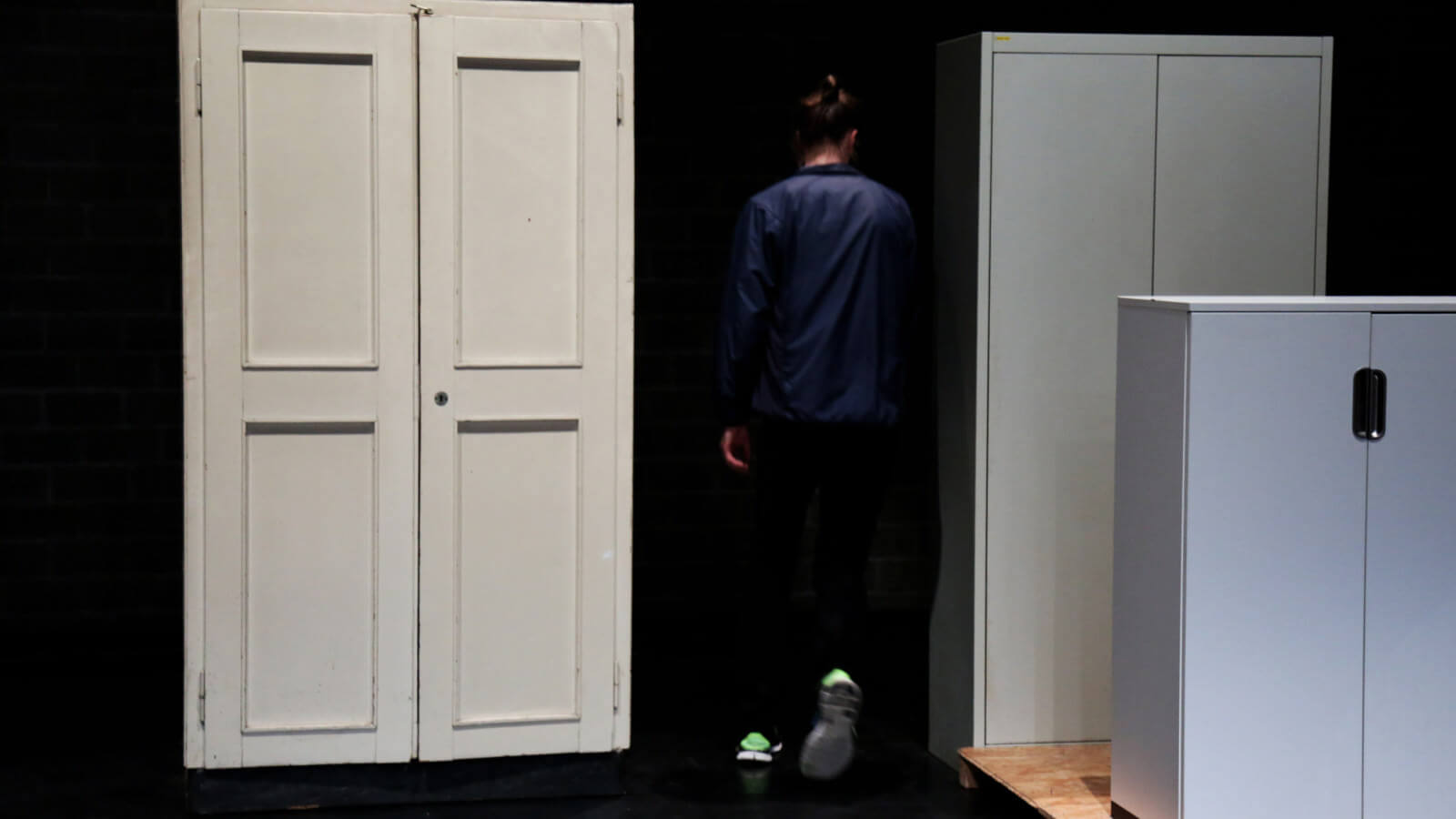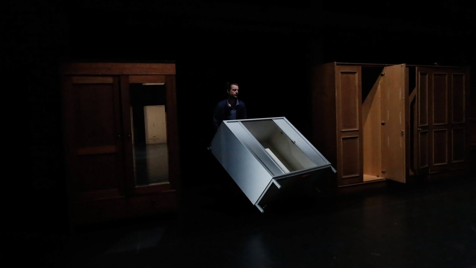 Es gilt, sich den örtlichen Gegebenheiten anzupassen und in einer Szenerie von Schränken unterzutauchen, in der jedes Ding zum potentiell belebten Gegenüber wird. Vor dem Hintergrund global zunehmender Krisen und Gewaltbereitschaft thematisieren Hofmann&Lindholm die Zuflucht im toten Winkel, im Versteck, im Hinterhalt. Dabei beschränkt das Regieteam bewusst die Möglichkeit zur Einsicht, bietet aber auch Gelegenheiten für einen Perspektivwechsel im 4-Minuten-Takt.